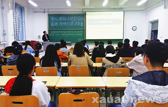 牛腾首先就“全国大学生互联网+创新创业大赛”和“环境友好科技竞赛”向大家做了赛事介绍。他依次从比赛概况、参赛流程、参赛组别和赛程安排等方面为同学们进行解读,并鼓励大家应当积极参加科技竞赛,持续发力,逐年积累经验。